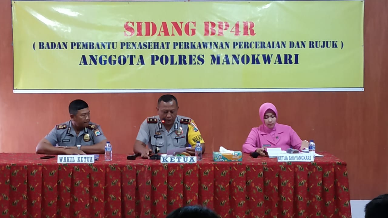Sidang BP4R ini, Wakapolres Manokwari KOMPOL Winarto, SH., Selaku Pimpinan sidang yang didampingi oleh Kabag Sumda Polres Manokwari AKP Saridal, SH., dan Ketua Bhayangkari Cabang Manokwari Ny. Tika Adam yang dihadiri oleh Kabag Ren Kompol Andarias lipan, SH., Kasat Lantas IPTU Tatak Heru Latif, SH.MH., kasi Propam, Orang Tua /Wali kedua Calon mempelai sidang BP4R serta pengurus Bhayangkari dan Perwakilan Personil Polres Manokwari.