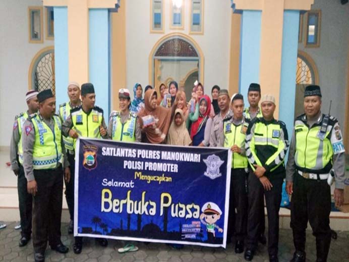 Tribratanewspapuabarat.com-Kapolres Manokwari AKBP Christian Rony Putra, Sik,Mh melalui Kasat Lantas Akp Sunarko dan Jajaran Marks berbagi Takjil di Masjid-Masjid menjelang Buka Puasa. Senin (5/6/2017) pukul 16.30 Wit.